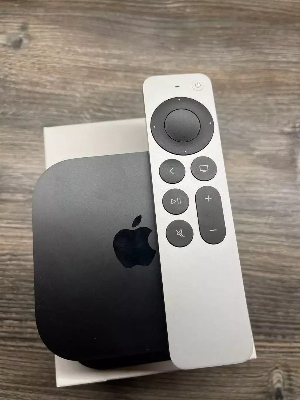 Like the previous version, the Siri Remote has a flat shape. However, the remote is now more comfortable, albeit heavier. Its body material is aluminum in a matte gray color, with black buttons. At the top is a round combined navigation panel-button platform. The large circle in the center serves as a touch-sensitive panel and confirmation button, while a thin ring around it indicates directions for pressing. The power button is located at the top, and the Siri button on the side. The remaining buttons are arranged in two columns: on the left – “Play and Pause,” “Back,” “Mute”; on the right – TV and volume control. The remote also features a microphone for Siri usage and a USB-C port for charging.