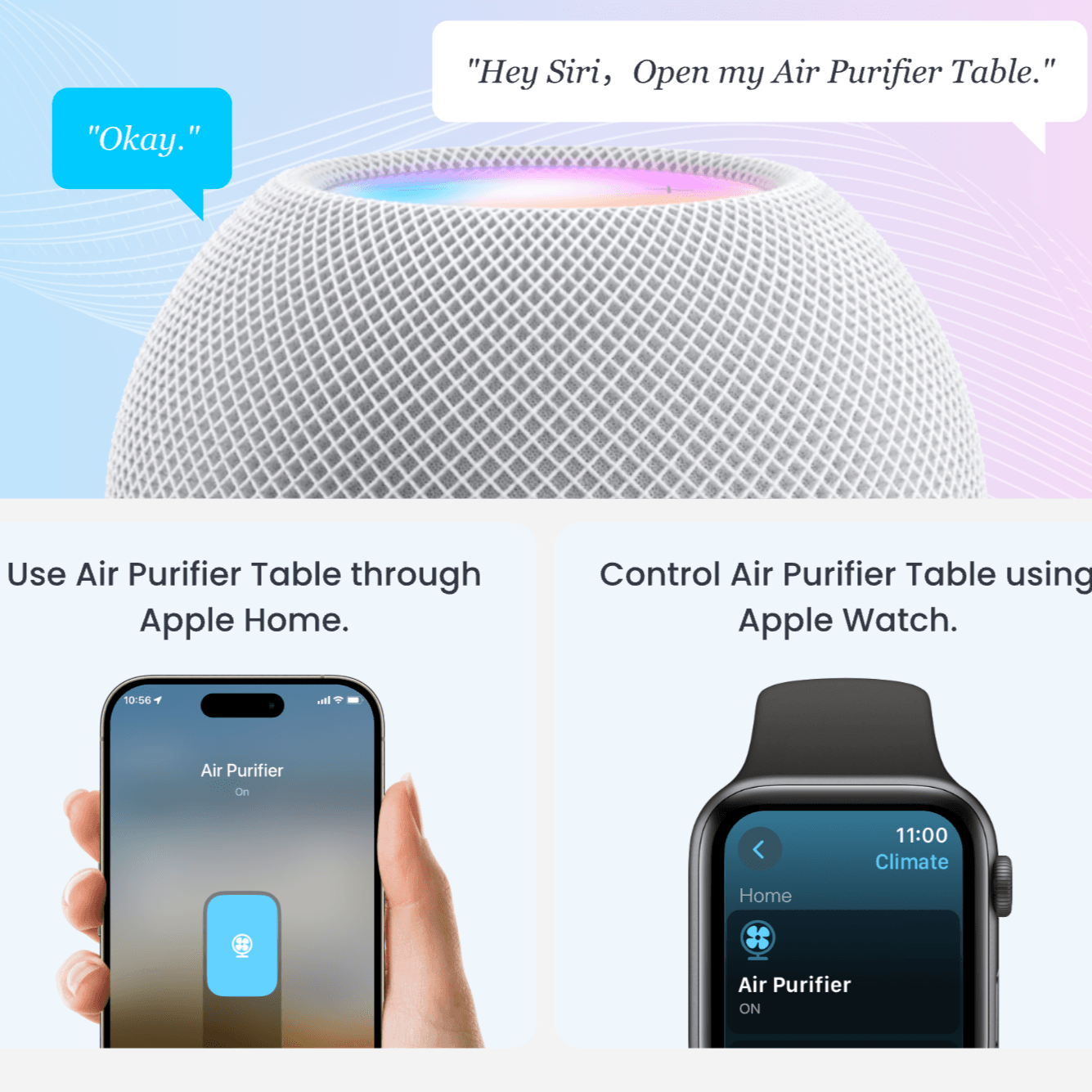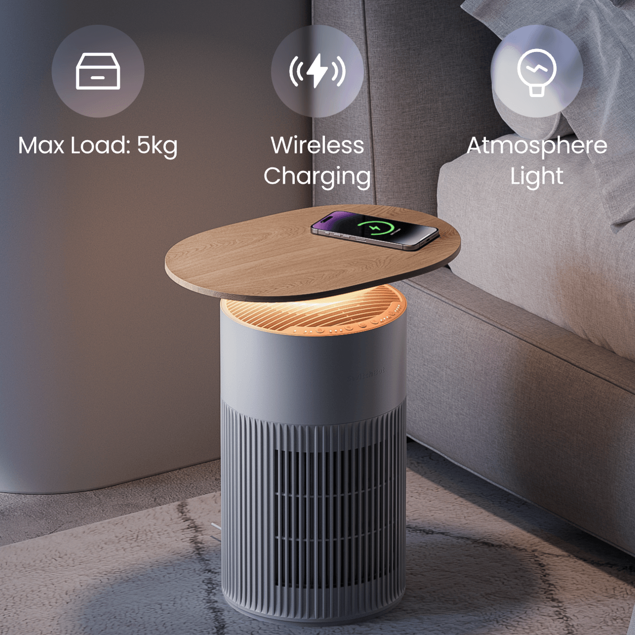 • Vairāku funkciju apvienojums: gaisa attīrītājs, galdiņš, bezvadu lādētājs un apgaismojums vienā ierīcē.